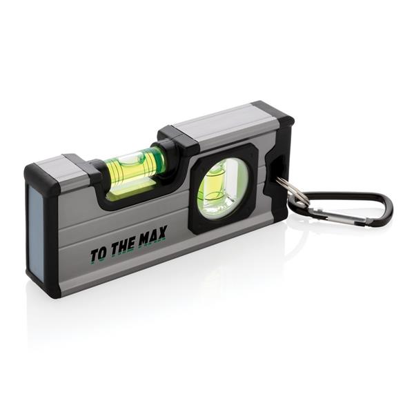 Poziomica, długość 12 cm, 2 płaszczyzny pomiaru, obudowa wykonana z aluminium, wbudowany magnes, z karabińczykiem, ślad węglowy produktu: 2,73 kg CO2