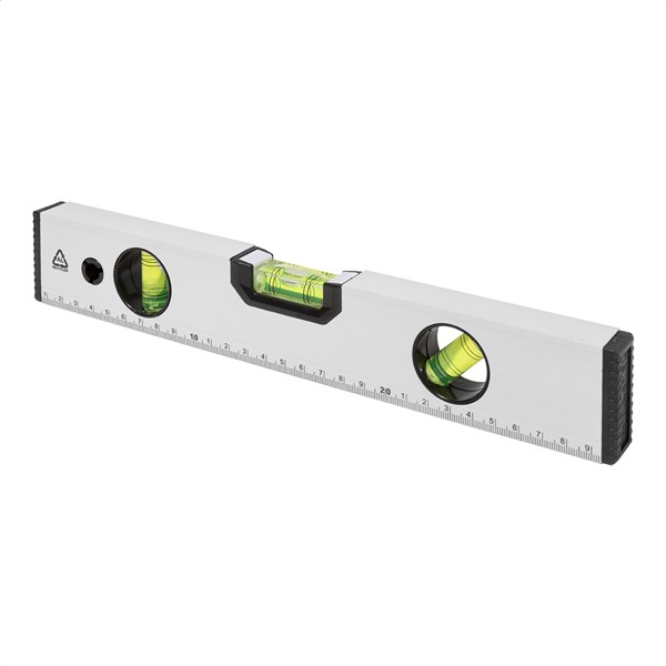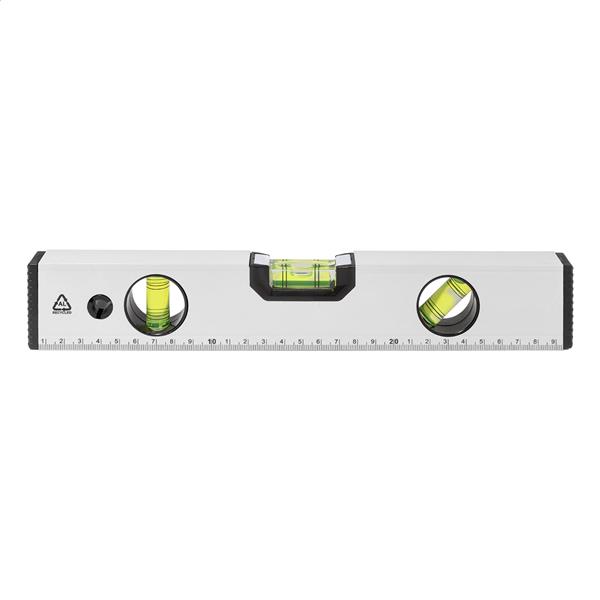 Poziomica magnetyczna wykonana z recyklingowanego aluminium z trzema poziomicami (poziomą, pionową i 45°) i linijką o długości 30 cm.