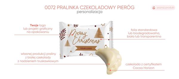 Czekoladowe pierożki to nietypowe praliny, uwodzące smakiem, a także wyjątkowy upominek firmowy, idealny do przekazania kontrahentom i klientom podczas okresu przedświątecznego. Każda pralinka, starannie zapakowana w folię kompostowalną lub monofolię nadającą się do recycklingu. Pralinka jest nie tylko smaczna, ale posiada proekologiczne opakowanie, co podkreśla zaangażowanie w ochronę środowiska.