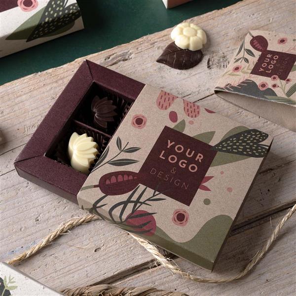 Pralinki Harmony Quartet są zapakowane w eleganckie pudełeczko, którego szatę graficzną można dostosować do potrzeb Twojej marki. Dostępne opcje papieru obejmują: