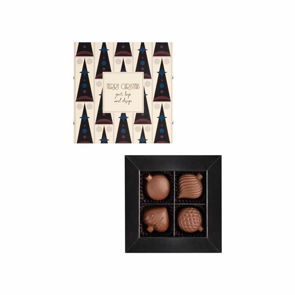 PRALINY CHRISTMAS MOMENTS QUARTET to zestaw 4 mlecznych pralinek z nadzieniem z typowo świątecznych smakach. Już jedna pralina czekoladowa z nadzieniem, które budzi świąteczne skojarzenia, wystarczy, by wywołać uśmiech. A cały kwartet uroczych bombek z czekolady to idealna bombonierka – a więc zestaw pralin świątecznych musi trafić na listę Twoich firmowych prezentów świątecznych.