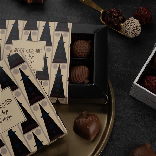 Mini forma bombonierki pozwala na promocję premium przy ograniczonym budżecie lub w szeroko zakrojonej akcji. Każdą pralinkę umieszczamy w papierowej papilotce, a wszystkie 4 w biodegradowalnym opakowaniu, w całości wykonanym z papieru certyfikowanego FSC.