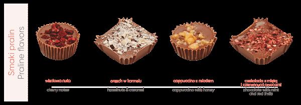 Praliny premium Gold Cups to luksusowy zestaw 8 nadziewanych czekoladek o wyjątkowej elegancji i smaku. Każda pralina została starannie wykonana z wysokiej jakości czekolady, a jej nadzienie zachwyca bogactwem smaków: wiśniowa nuta, cappuccino z miodem, orzech w karmelu oraz czekolada z miętą i maliną. Te złote praliny to doskonały wybór dla tych, którzy cenią sobie wyjątkowe doznania smakowe i elegancję. Postaw na słodki prezent firmowy, który podkreśli wyjątkowość Twojej marki oraz szacunek, jakim darzysz klientów i parnterów.