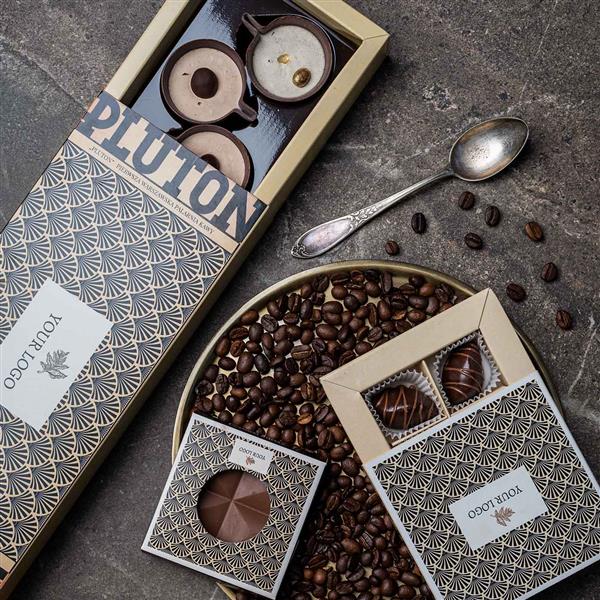 Praliny z kawą Pluton to elegancki i smakowity upominek, idealny na świąteczne okazje biznesowe. Świetnie sprawdzi się jako prezent za udaną transakcję, przeprowadzoną w danym roku, czy jako podziękowanie dla ważnego klienta lub partnera. Praliny dla kawoszy w pięknym opakowaniu w stylu art deco i ekologiczne materiały podkreślają dbałość o detale. Personalizowana powierzchnia opakowania umożliwia skuteczną promocję Twojej marki.
