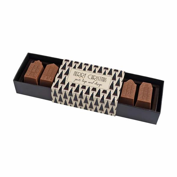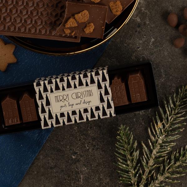 Świąteczne pralinki z logo w kształcie uroczych kamieniczek to doskonały prezent na Boże Narodzenie! Każda pralinka jest małym dziełem sztuki, dlatego idealnie sprawdzą się one jako prezent dla Twoich współpracowników i partnerów biznesowych. Niech każdy kęs tej czekolady przypomni o magii Świąt!