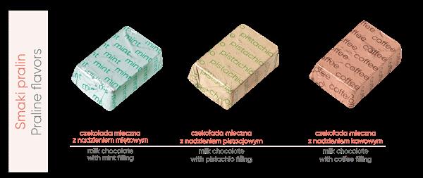 W tym w pełni ekologicznym, papierowym opakowaniu znajdziesz asortyment pralinek o trzech prostych składach i w trzech ulubionych smakach: miętowym, kawowym i pistacjowym.