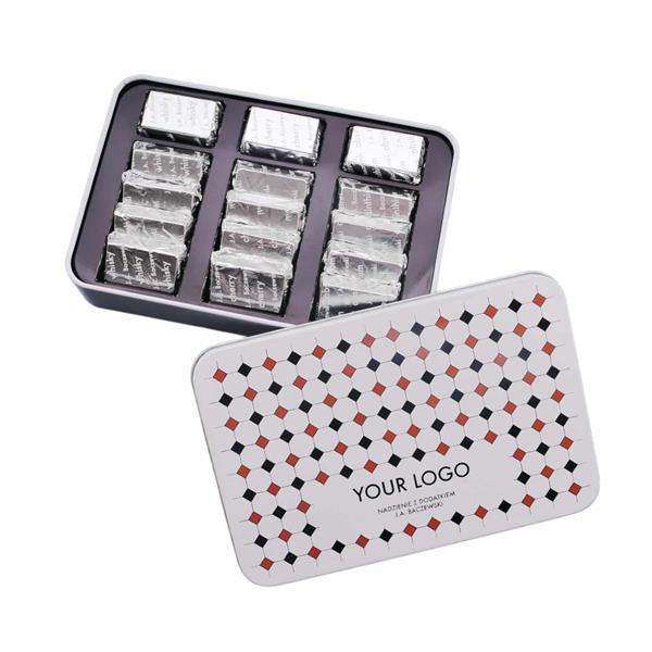 Czekoladki zostały umieszczone w eleganckiej puszce, która może być ponownie wykorzystana, zgodnie z ideą zero waste. Dodatkowo, oferujemy możliwość personalizacji opakowania – do wyboru jest nadruk na etykiecie z białego papieru lub papieru kraft, albo bezpośrednio na metalowej powierzchni puszki. Dzięki temu PRALINY ROZMAITOŚCI J.A. BACZEWSKI 15 SZT stają się nie tylko słodkim upominkiem, ale także skutecznym narzędziem promocji Twojej firmy.
