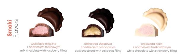 Wersje smakowe w zestawie: czekolada mleczna z nadzieniem malinowym, czekolada biała z nadzieniem truskawkowym, czekolada deserowa z nadzieniem pistacjowym.