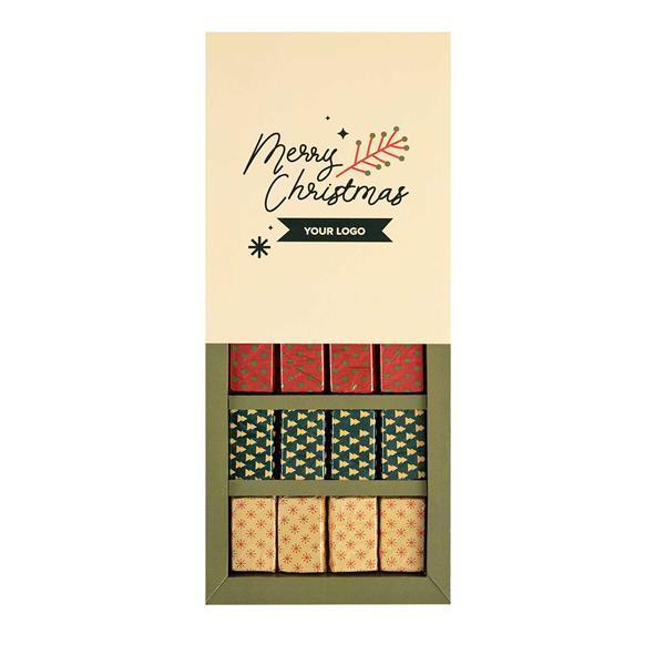PRALINY ŚWIĄTECZNE ROZMAITOŚCI 12 SZT to idealny sposób na wprowadzenie magii świątecznego smaku do każdej firmowej paczki prezentowej. Te wyjątkowe czekoladki, starannie oblane gęstą belgijską czekoladą, będą doskonałym wyrazem uznania i wdzięczności. Otrzymanie takiego upominku na Boże Narodzenie na pewno wywoła uśmiech na twarzy obdarowanego i sprawi, że Twoja marka zostanie zapamiętana w sposób słodki i pozytywny.