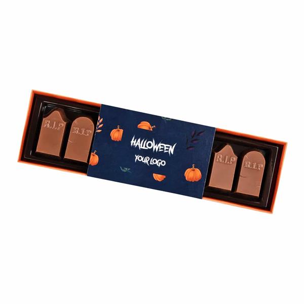 W marketingu nie boimy się śmiałych pomysłów, szczególnie przy okazji Halloween. Słodycze w formie nagrobków wykonane z mlecznej czekolady z nadzieniem z deserowej czekolady i sycylijskich orzechów laskowych to świetny pomysł na halloweenową bombonierkę.