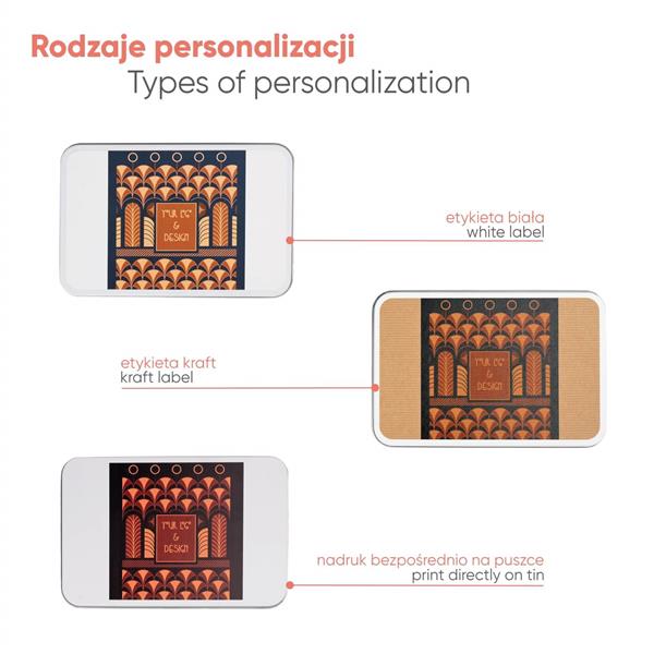 Oferujemy dwie opcje personalizacji produktu: nadruk cyfrowy na papierowej etykiecie z certyfikatem FSC lub nadruk cyfrowy UV bezpośrednio na puszce.