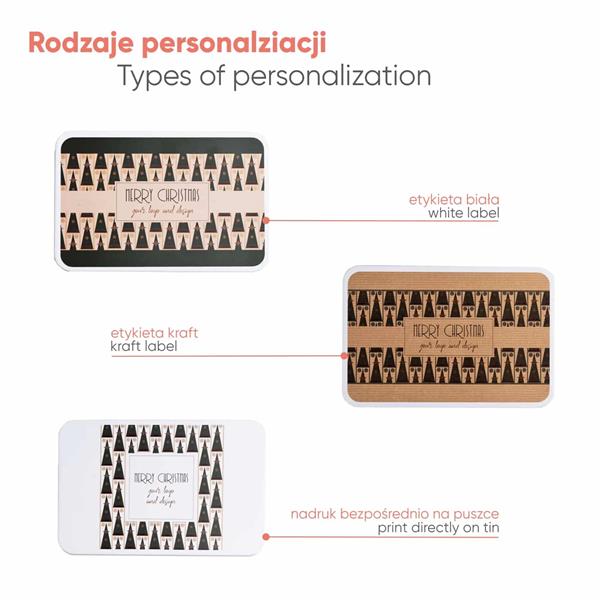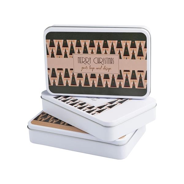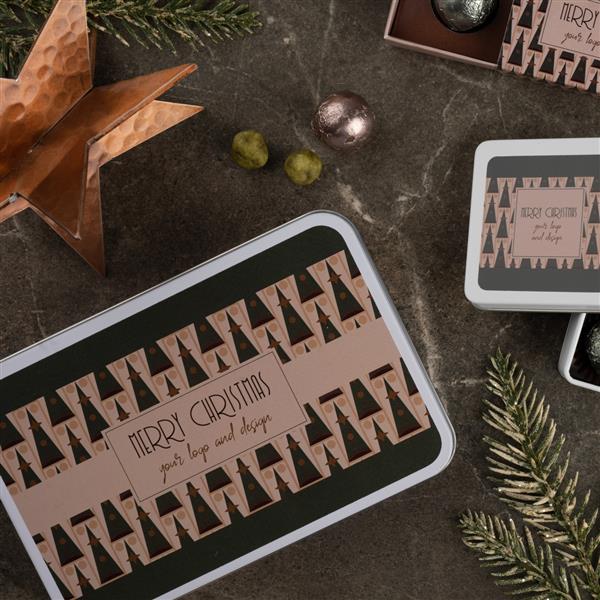 Kolekcję 12 wyśmienitych pralinek, umieściliśmy w eleganckim opakowaniu w formie metalowej puszki, dostępnej w dwóch kolorach – białym i srebrnym. Nadaj jej spersonalizowanego charakteru, umieszczając swoje logo, życzenia świąteczne lub świąteczną grafikę.
