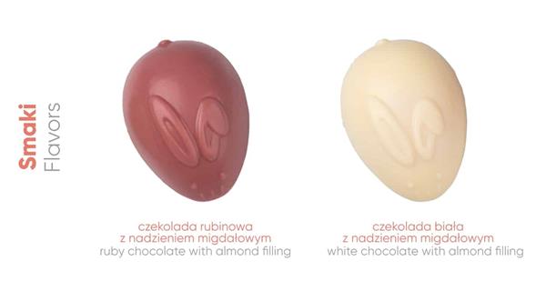 Bombonierka kryje słodkości w dwóch wariantach smakowych: z białej i rubinowej czekolady.