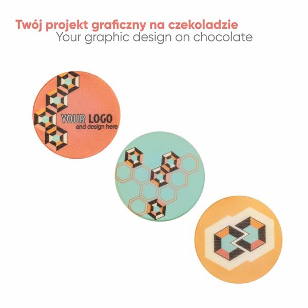 Każdy produkt personalizujemy podwójnie: bezpośrednio na czekoladzie oraz na opakowaniu. Mamy możliwość wykonania dowolnego projektu z kolorową grafiką, logo lub nazwą Twojej firmy!