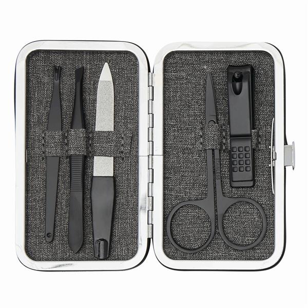 Zestaw do manicure PRETTY IN BLACK składający się z 5 elementów. Zawiera pilniczek do paznokci, pęsetę, nożyczki do skórek i paznokci, cążki oraz radełko do skórek. W prostokątnym etui z przyciskiem z boku.