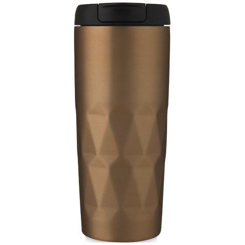Dwuścienny, miedziany, izolowany próżniowo kubek z zakręcaną, szczelną pokrywką, ozdobiony misternym wzorem geometrycznym. Izolowana konstrukcja ze stali nierdzewnej 18/8 utrzymuje ciepło lub chłód napojów przez kilka godzin. Bez BPA, przetestowany i zatwierdzony zgodnie z niemiecką ustawą o bezpieczeństwie żywności (LFGB) oraz poddany testom na zawartość ftalanów zgodnie z przepisami REACH. Pojemność 450 ml. Zaleca się mycie ręczne. Zapakowany w kartonowe pudełko upominkowe wykonane z materiałów pochodzących z recyklingu.