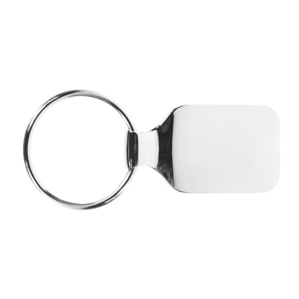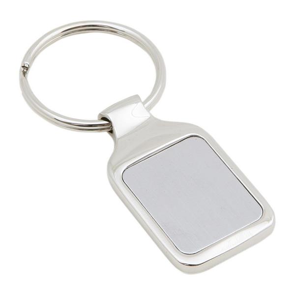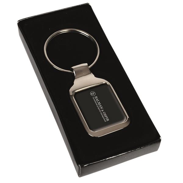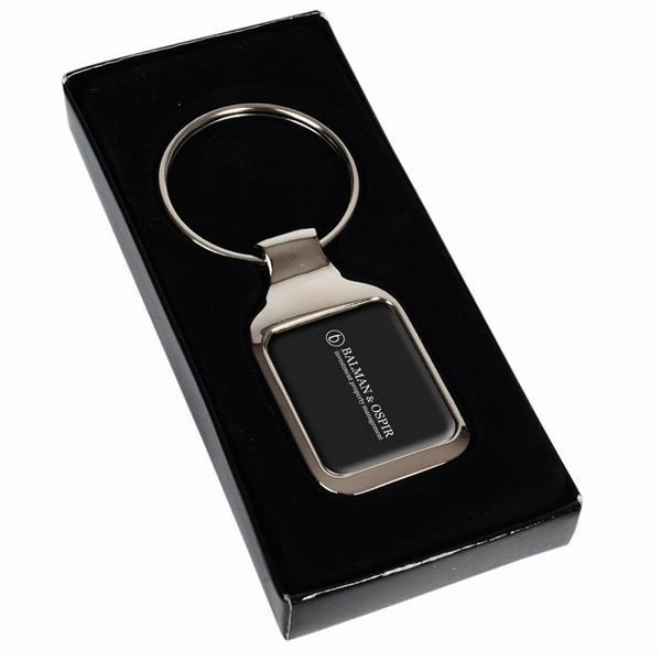 Prostokątny brelok do kluczy z dedykowanym miejscem pod znakowanie, czarne pudełko podarunkowe w komplecie, produkt wykonany z metalu