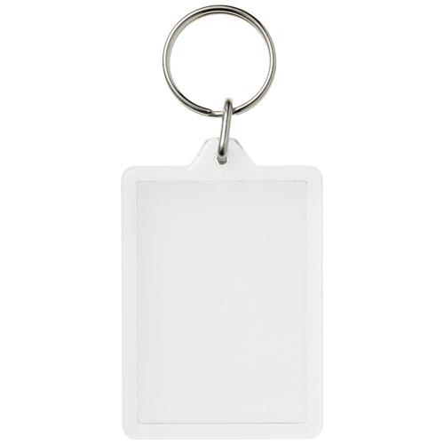 Prostokątny breloczek C1 z metalowym pękiem na klucze. Metalowy pierścień cechuje płaski profil, który idealnie nadaje się do wysyłek. Wymiary wkładu do druku: 5,0 cm x 3,5 cm.