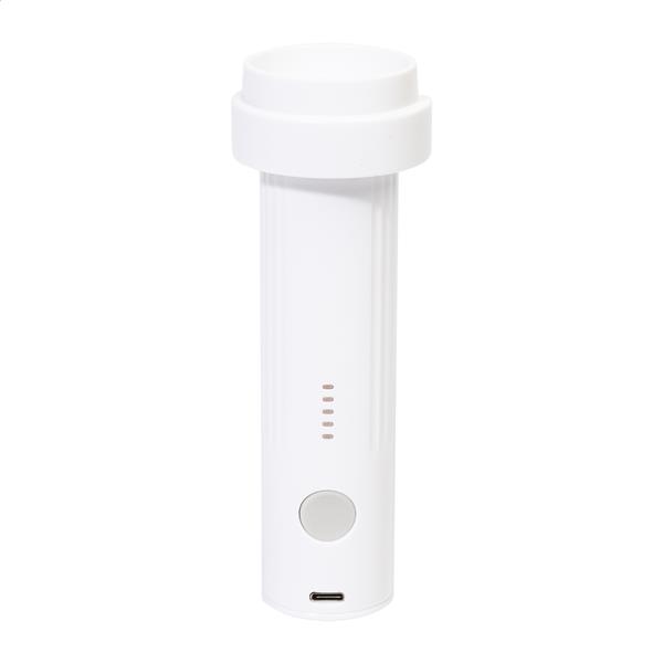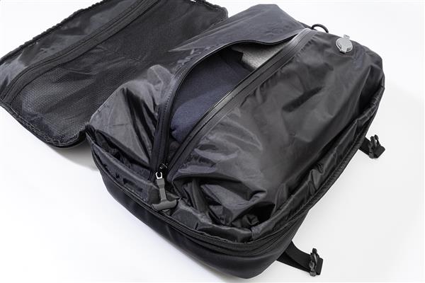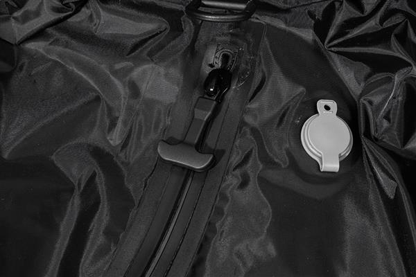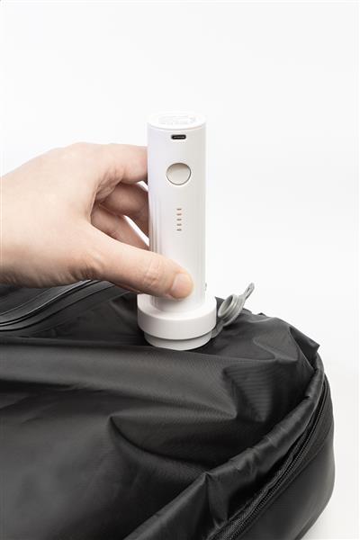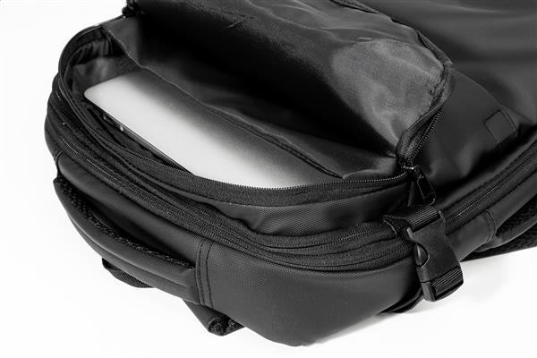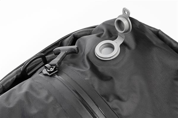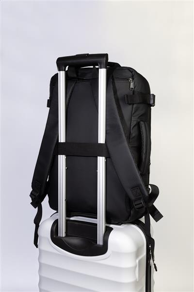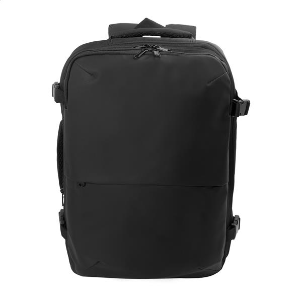 Wodoodporny, przedłużany plecak kompresyjny z przegrodami zapinanymi na zamek, wbudowaną próżniową komorą kompresyjną, wyściełaną przegrodą na laptopa (15″) i przednią kieszenią zapinaną na zamek. Z bocznymi klamrami, paskiem do wózka, wyściełanym tyłem i paskami na ramiona. Poliester 600D powlekany PU. W zestawie pompka próżniowa z akumulatorem USB (1500 mAh).