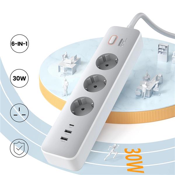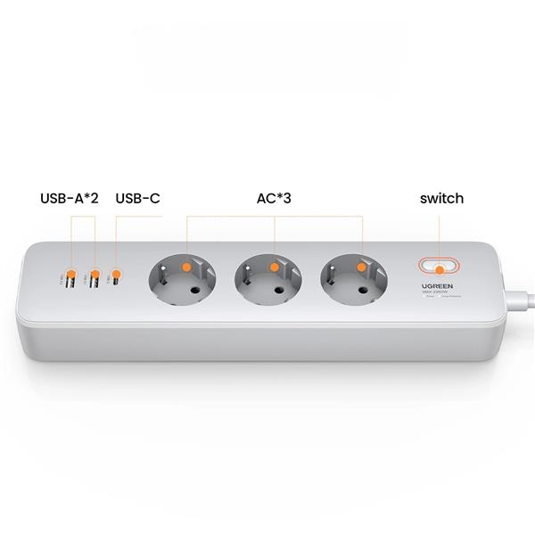 Przedłużacz Ugreen CD286 to urządzenie 6w1. Dzięki 3 gniazdom AC, 2 portom USB-A oraz 1 portowi USB-C możesz jednocześnie podłączyć laptopa, smartfon czy tablet. Ten przedłużacz poradzi sobie z każdym zadaniem. Jego kompaktowy design i wbudowany włącznik sprawiają, że jest to idealne rozwiązanie zarówno do domu, jak i biura.