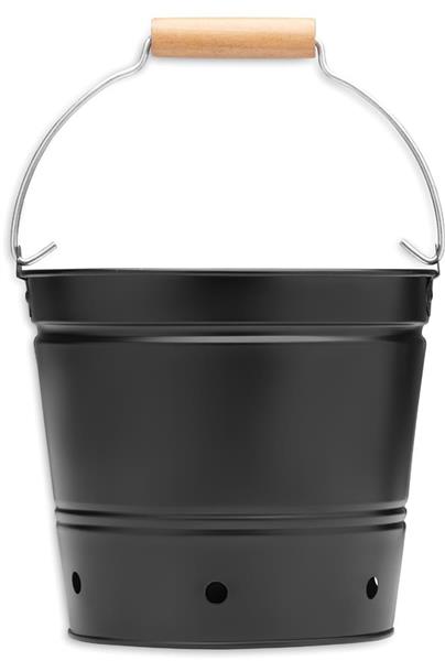 Żeliwny przenośny grill kubełkowy z rusztem ze stali nierdzewnej i drewnianą rączką.