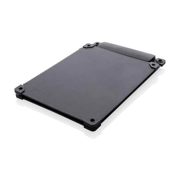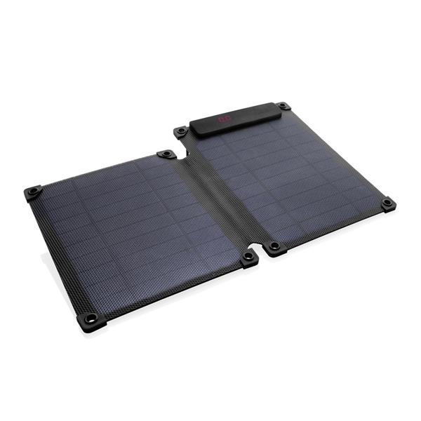 Panel słoneczny 10W, wskaźnik prędkości ładowania, stojak, wodoodporny IPX6 (całkowite zabezpieczenie przed strumieniem wody płynącej z różnych kierunków z wydajnością do 100 litrów na minutę), wyjścia USB i USB typu C (5V/1A max.), wykonany z PET i ABS z recyklingu z certyfikatem RCS, w pudełku z papieru kraftowego z certyfikatem FSC®, ślad węglowy produktu: 12,32 kg CO2
