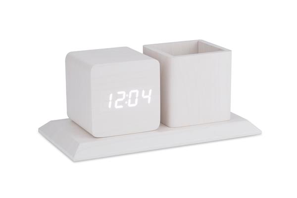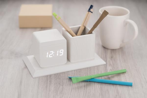Organizer na biurko wykonany z płyty MDF o modnym wykończeniu w kolorze jasnego drewna, który świetnie pasuje do nowoczesnych pomieszczeń. Posiada pojemnik na długopisy oraz zegar z funkcjami: kalendarza, alarmu oraz termometru.