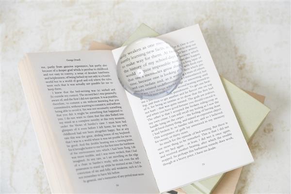 Szklany przycisk do papieru i lupa. W czarnym papierowym pudełku prezentowym z aksamitną wkładką i magnetycznym zamknięciem.