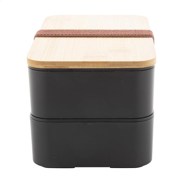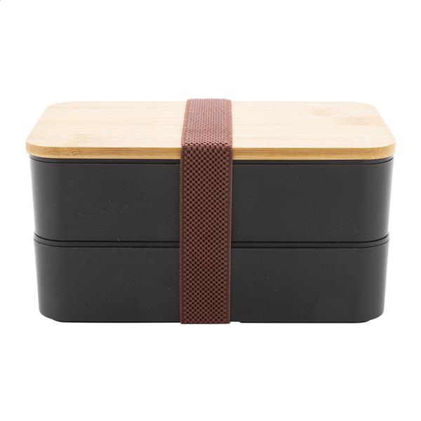 Pudełko śniadaniowe z tworzywa PP z zestawem sztućców (widelec, łyżka i nóż), bambusową pokrywką i elastycznym paskiem. Z 2 przegródkami o pojemności 700 ml każda.