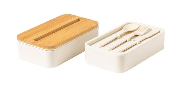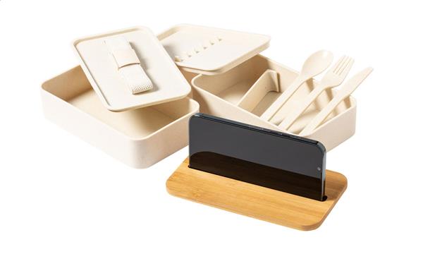 Pudełko na lunch z plastiku PP z zestawem sztućców (widelec, łyżka i nóż), bambusową pokrywką z uchwytem na telefon komórkowy i elastycznym paskiem. Z 2 przegródkami o pojemności 700 ml każda.