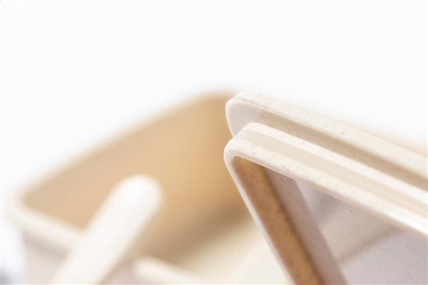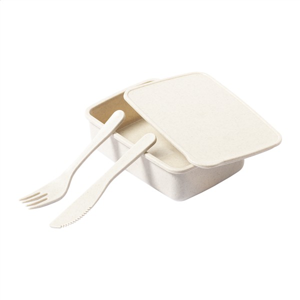 Pudełko śniadaniowe z tworzywa sztucznego PP z zestawem sztućców (nóż i widelec) oraz elastycznym paskiem. 700 ml.