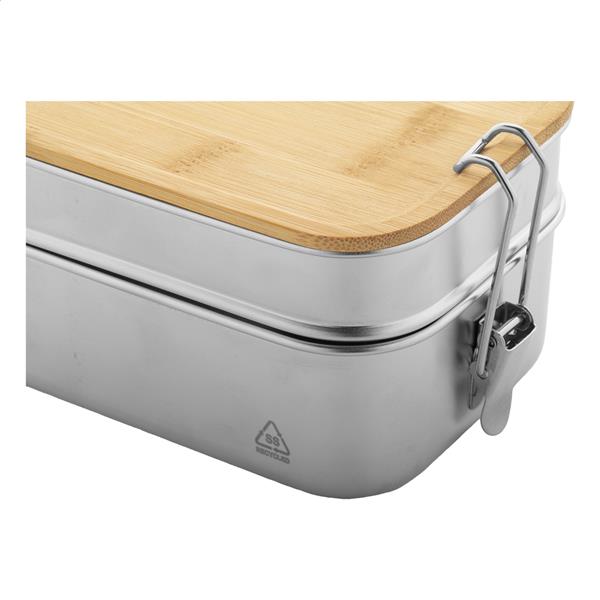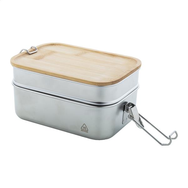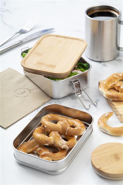 Pudełko na lunch ze stali nierdzewnej pochodzącej z recyklingu z bambusową pokrywką i bezpiecznym zamknięciem na klamrę. Z 2 przegródkami o pojemności 340 i 600 ml.