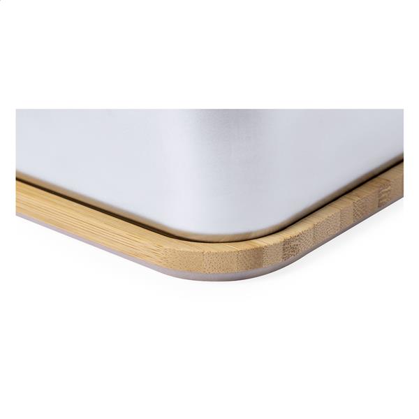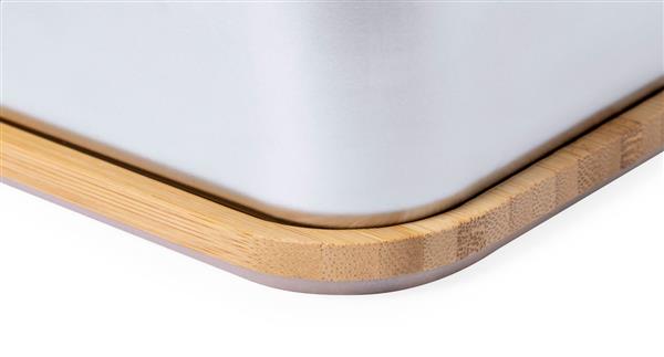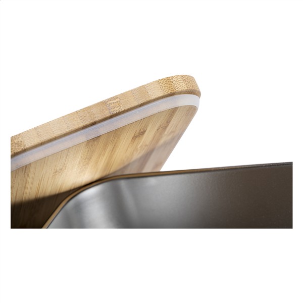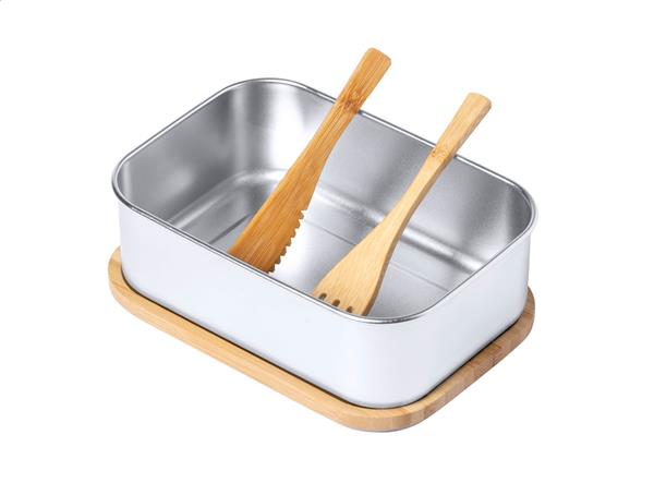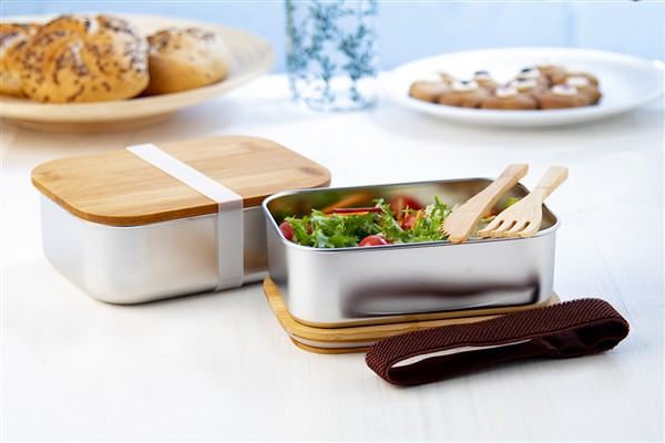 Pudełko na lunch ze stali nierdzewnej z pokrywką z naturalnego bambusa. Ze sztućcami (nóż i widelec) oraz elastycznym paskiem. 600 ml.
