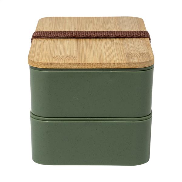 Pudełko śniadaniowe z tworzywa PP z zestawem sztućców (widelec, łyżka i nóż), bambusową pokrywką i elastycznym paskiem. Z 2 przegródkami o pojemności 700 ml każda.