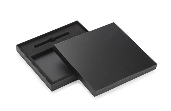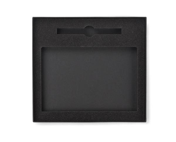 Czarne pudełko wykonane z mocnego, solidnego materiału, matowe dla lepszego efektu. Wewnątrz wyłożone jest pianką, Wykrojoną pod notes A5 i długopis. Idealne dla notesów FLAF, LORE czy VITAL oraz większości długopisów z oferty BC. Pudełko sprzedawane jest bez wyposażenia. Wyprodukowano w Polsce.