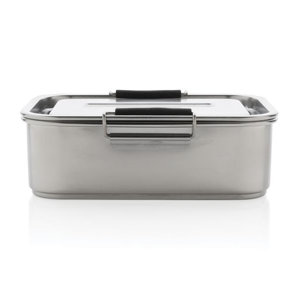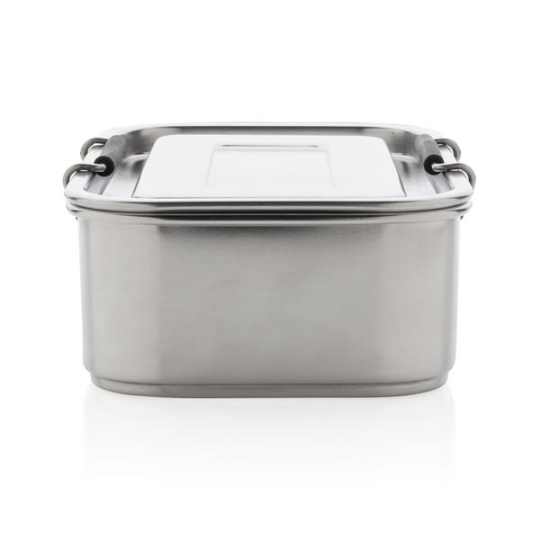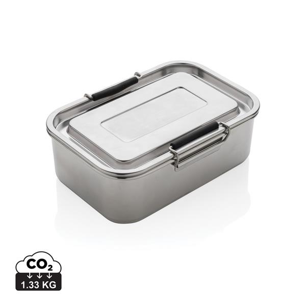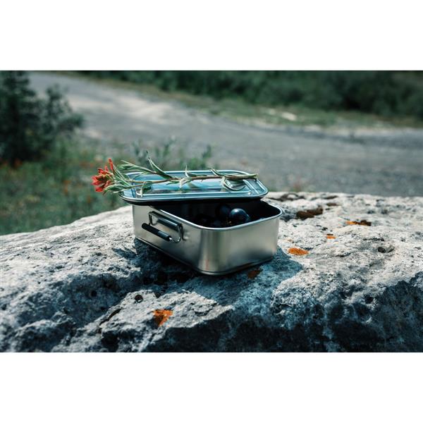 Pudełko śniadaniowe 800 ml, lunchbox, zamykane na 2 zatrzaski, solidne i szczelne, wykonane w 95% ze stali nierdzewnej z recyklingu, wykorzystane materiały posiadają certyfikat GRS (Global Recycled Standard) który gwarantuje, że wykorzystane materiały pochodzą z recyklingu, zawartość materiału z recyklingu jest obliczana w oparciu o wagę całkowitą przedmiotu, wyłącznie do zimnych potraw, nie należy używać w kuchence mikrofalowej i myć w zmywarce, w opakowaniu z papieru kraftowego, ślad węglowy produktu: 1,33 kg CO2