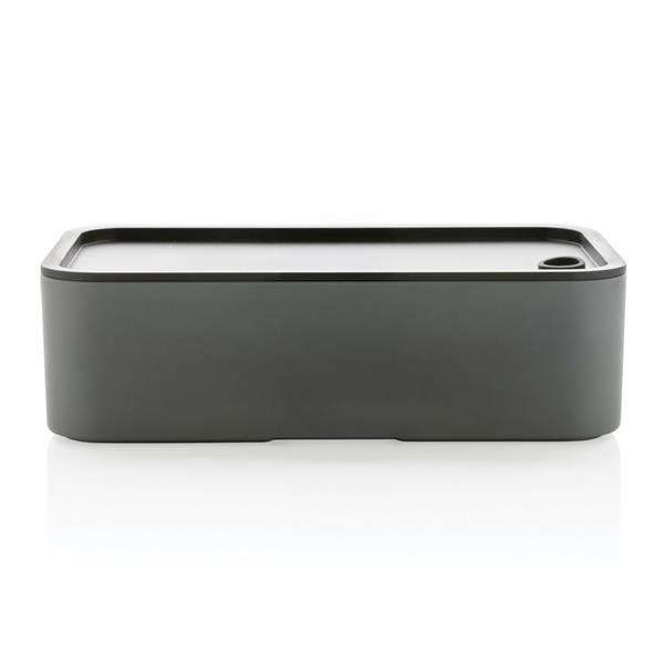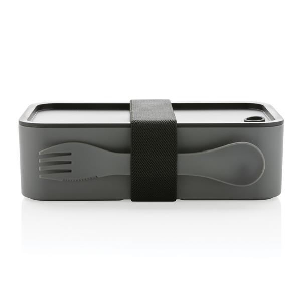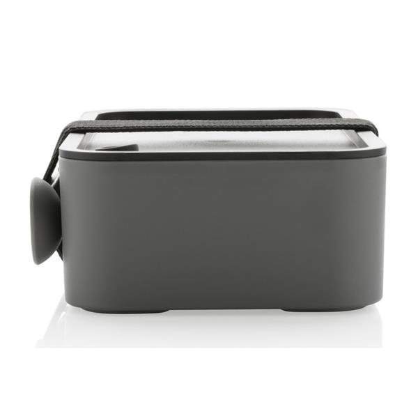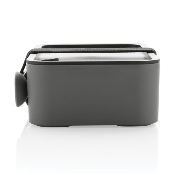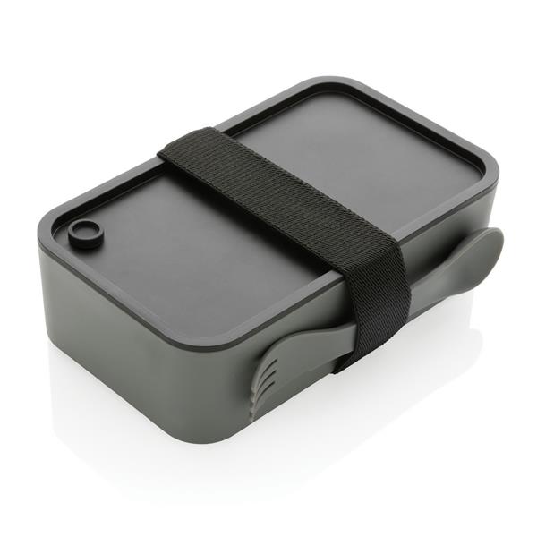 Pudełko śniadaniowe 1,2 L, lunchbox, wykonany w 93% z PP pochodzącego z recyklingu z certyfikatem GRS (Global Recycled Standard) który gwarantuje, że wykorzystane materiały pochodzą z recyklingu, w komplecie łyżkowidelec i elastyczny pasek, nie należy myć w zmywarce i używać w kuchence mikrofalowej