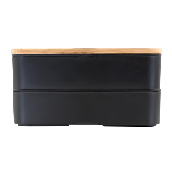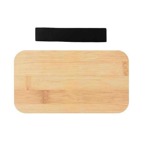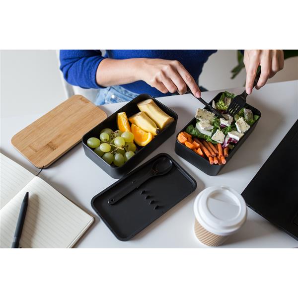 Pudełka śniadaniowe 2 w 1, 2 pojemniki o pojemności 500 ml, w komplecie znajduje się: widelec, nóż oraz łyżka, wieczko jednego z pojemników posiada bambusową górną część, wieczko drugiego pojemnika z miejscem na sztućce, pojemniki połączone elastycznym paskiem, produkt wykonany z PP, bambusa oraz gumy