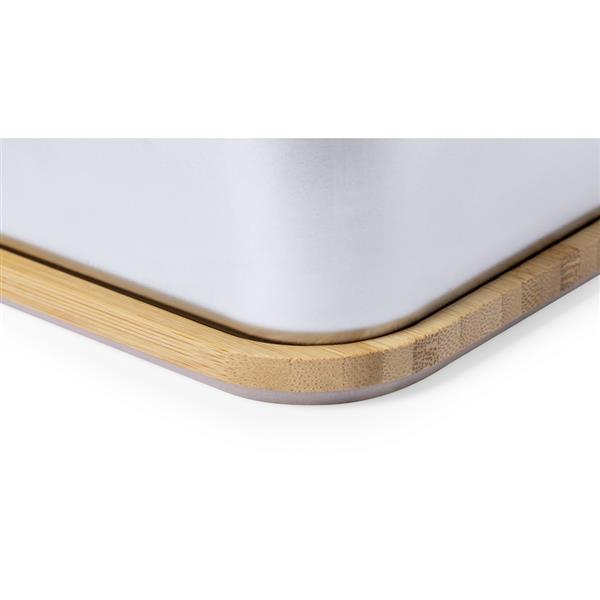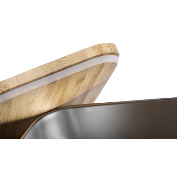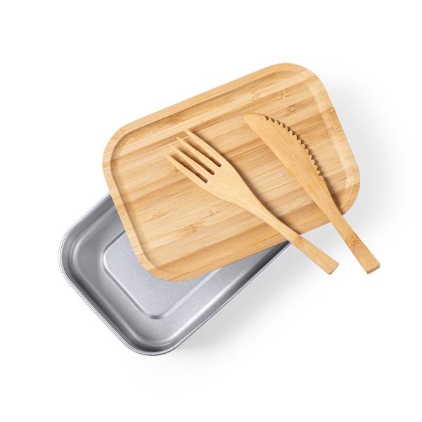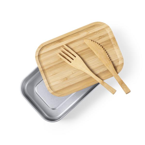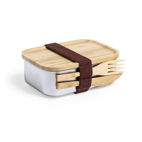 Pudełko śniadaniowe 600 ml ze stali nierdzewnej z bambusowym wieczkiem, w komplecie nóż i widelec, połączone paskiem