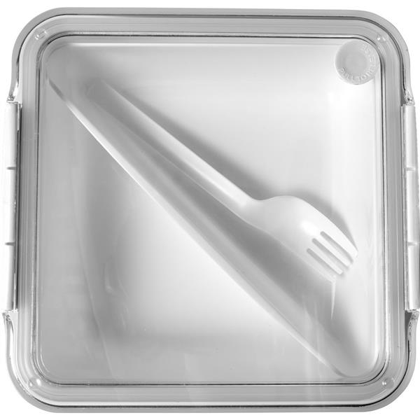 Pudełko śniadaniowe 920 ml, przezroczyste wieczko z silikonowym zamknięciem, trójkątna przegroda oraz widelec w komplecie