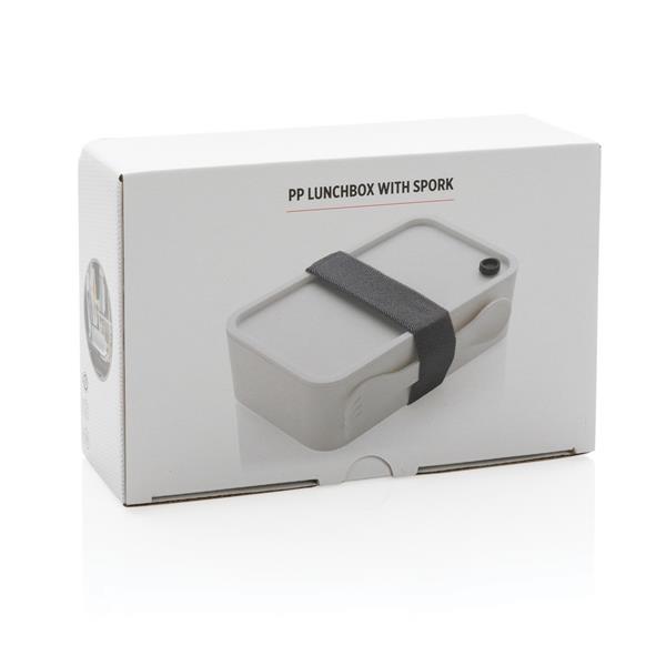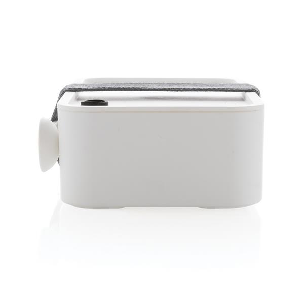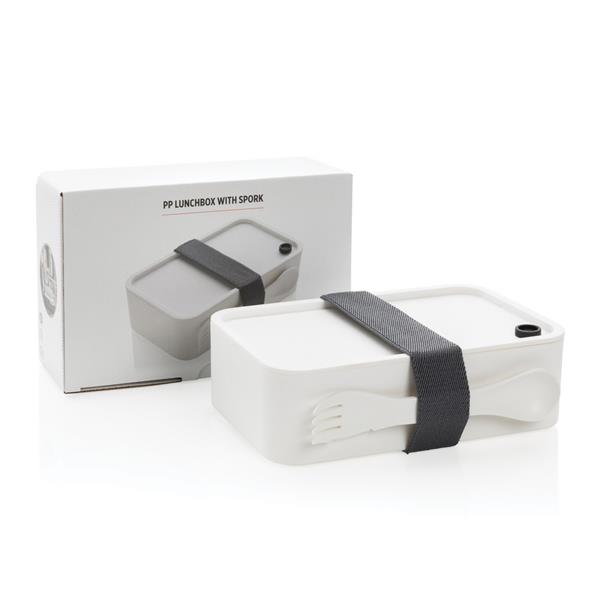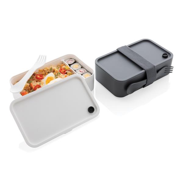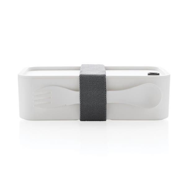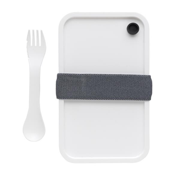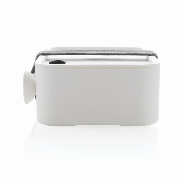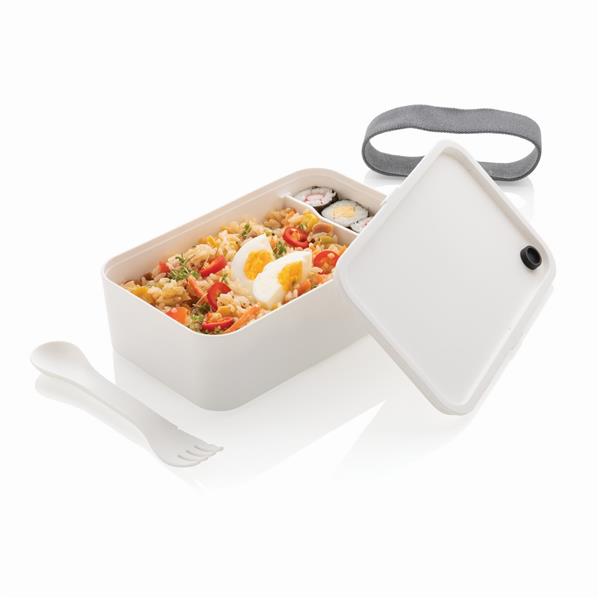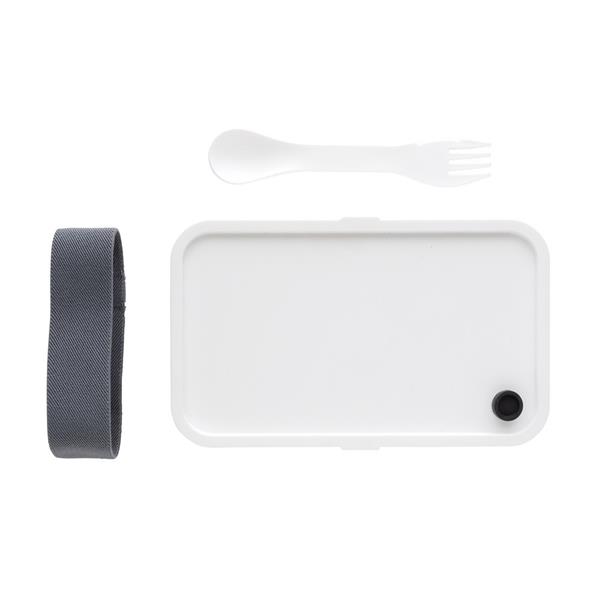 Pudełko śniadaniowe 1,2 L, lunchbox, wykonany w 93% z PP pochodzącego z recyklingu z certyfikatem GRS (Global Recycled Standard) który gwarantuje, że wykorzystane materiały pochodzą z recyklingu, w komplecie łyżkowidelec i elastyczny pasek, nie należy myć w zmywarce i używać w kuchence mikrofalowej
