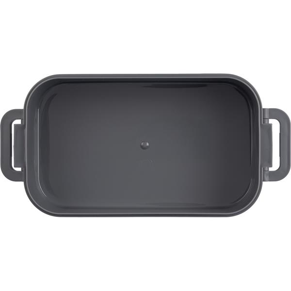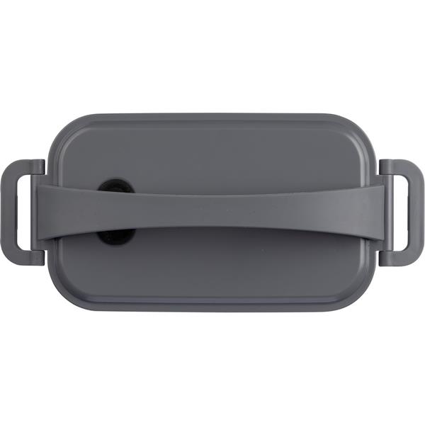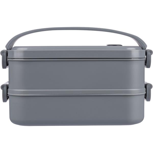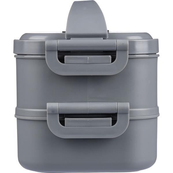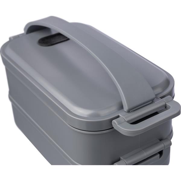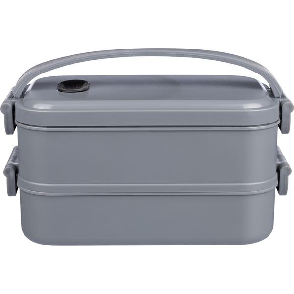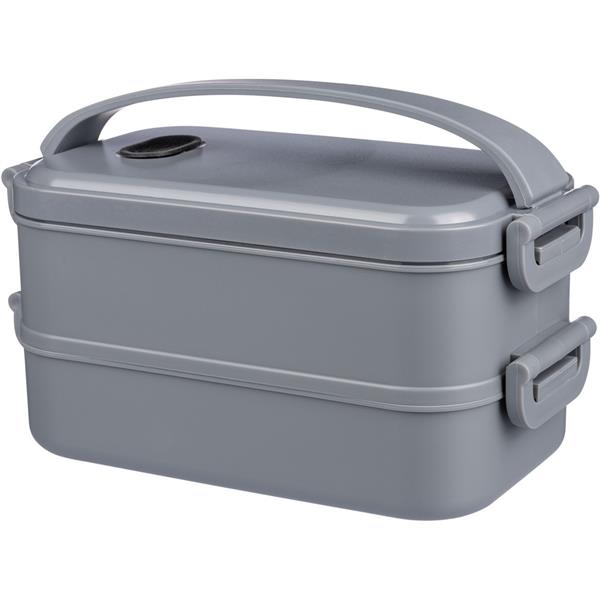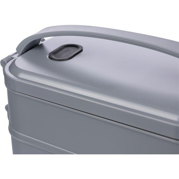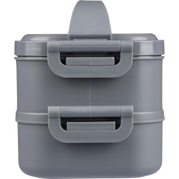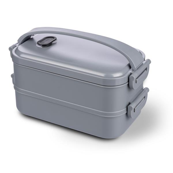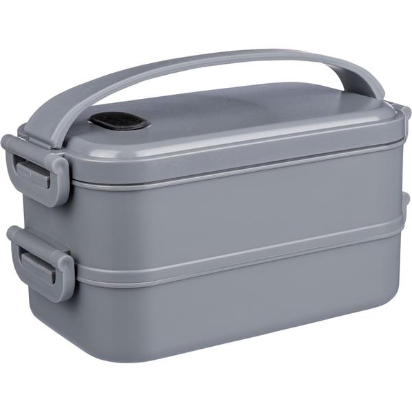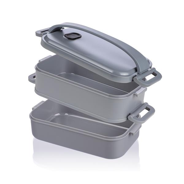 Pudełko śniadaniowe o łącznej pojemności 1600 ml, podzielone na dwie warstwy po 800 ml, posiada silikonowy zawór odpowiedni do użytku w kuchence mikrofalowej, zamknięcie na klamrę, silikonowy uchwyt do przenoszenia, pudełko nie nadaje się do mycia w zmywarce, pakowane zbiorczo, produkt wykonany z PP