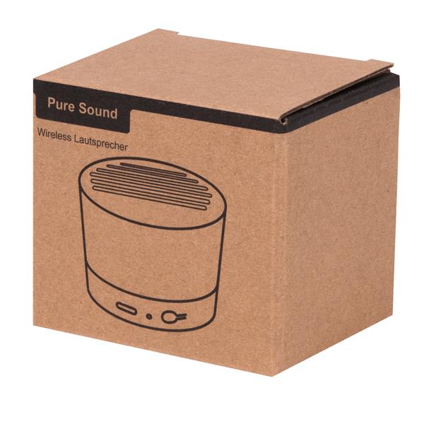Głośnik bezprzewodowy PURE SOUND: wytworzony z aluminium pochodzącego z recyklingu na bambusowej podstawie, moc muzyczna 3W, zasięg ok.10 m, do parowania z telefonem komórkowym, bezprzewodowym odtwarzaczem MP3, tabletem itp., kompatybilny z Bluetooth; w zestawie kabel ładujący USB C o długości ok. 120 cm, funkcja głośnomówiąca, moc wejściowa: 5V/1A, zintegrowany akumulator 300 mAh.