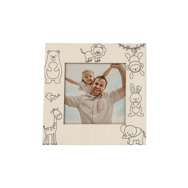 Ramka do zdjęć do kolorowania, 5 kredek, ramka o wymiarach 7,5 x 7,5 cm, produkt wykonany z drewna