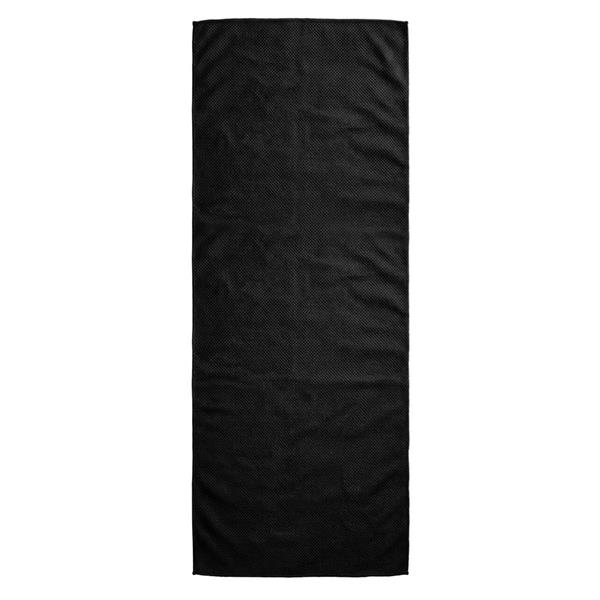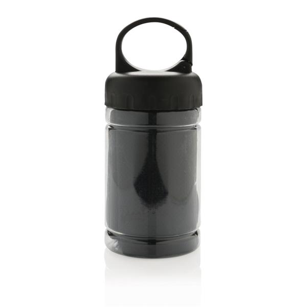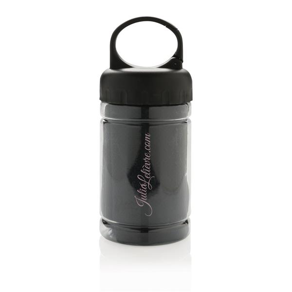 Ręcznik chłodzący z mikrofibry w pojemniku z PP, wieczko z ABS, ochrona przeciwsłoneczna na poziomie 98% i do UV 50+, funkcja chłodzenia po wlaniu zimnej wody do butelki, karabińczyk w komplecie, wymiar po rozłożeniu 77 x 30cm, ślad węglowy produktu: 0,8 kg CO2
