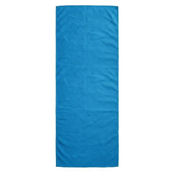 Ręcznik chłodzący z mikrofibry w pojemniku z PP, wieczko z ABS, ochrona przeciwsłoneczna na poziomie 98% i do UV 50+, funkcja chłodzenia po wlaniu zimnej wody do butelki, karabińczyk w komplecie, wymiar po rozłożeniu 77 x 30cm, ślad węglowy produktu: 0,8 kg CO2