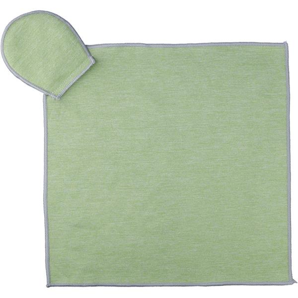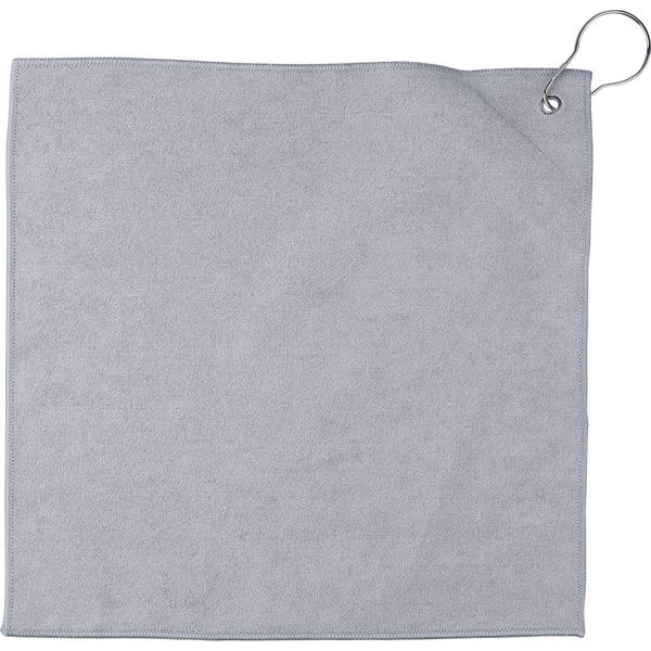 Ręcznik golfowy, z wbudowaną kieszonką na piłkę golfową, wyposażony w metalowy haczyk umożliwiający łatwe przymocowanie do torby, wewnątrz znajduje się ikona RPET na metce, można prać w pralce (na zimno), produkt wykonany z RPET