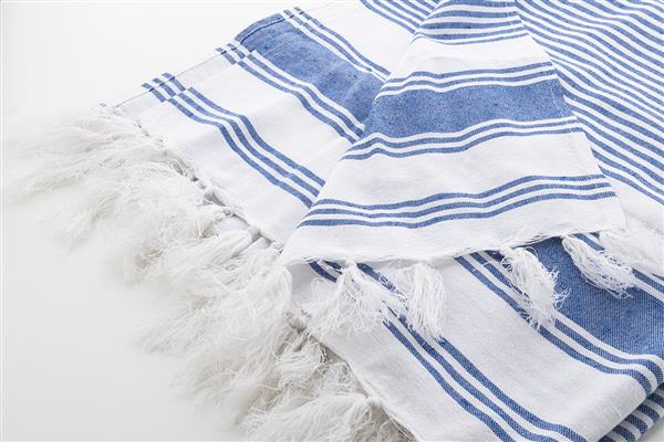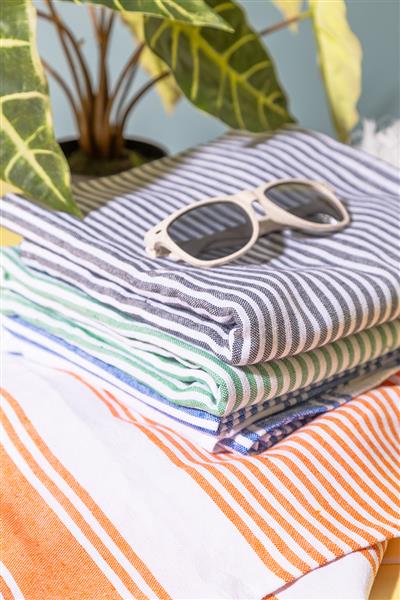 Dwukolorowy ręcznik plażowy typu pareo w paski, wykonany w 70% z bawełny i w 30% z poliestru. Gramatura 210 g/m2.