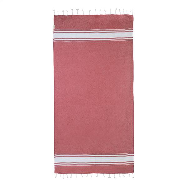 Dwukolorowy ręcznik plażowy typu pareo wykonany w 70% z bawełny pochodzącej z recyklingu i w 30% z poliestru RPET, 180 g/m2