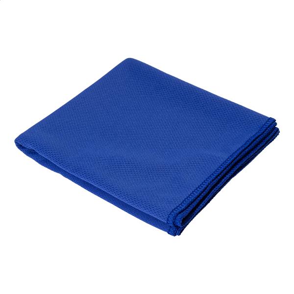 Ręcznik sportowy z mikrofibry RPET w woreczku z włókniny RPET z charakterystyczną mertką RPET. Poliester RPET, 140 g/m2.